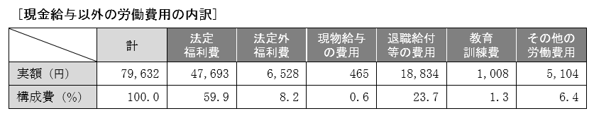 C 「現金給与以外の労働費用」の内訳とその占める割合は、「退職給付等の費用」が59.9%と最も高く、次いで「法定外福利費」23.7%、「法定福利費」8.2%などとなっている。
