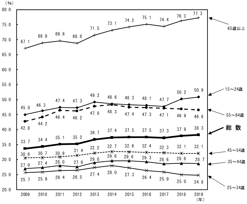 非正規の職員・従業員の割合を年齢階級別にみると、65歳以上は2020年平均で76.5%と、前年に比べ0.8ポイントの低下、15~24歳は49.2%と1.7ポイントの低下などとなった。
