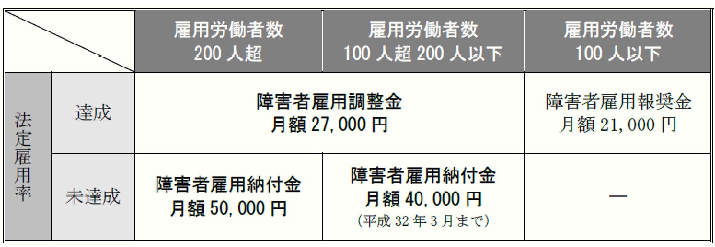 ※令和2年3月までは、雇用労働者数100人超200人以下の企業が未達成の場合には、障害者雇用納付金は月額4万円に減額されていましたが、令和2年4月からは50,000円になっています。