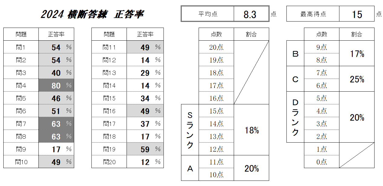 横断対策講座④で行った横断答練の正答率が出ていますので、ご案内させていただきます。