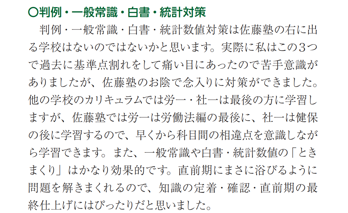 例年、他の予備校を利用している方でも、白書・統計数値対策講座だけには佐藤塾に参加する方がいらっしゃいます。