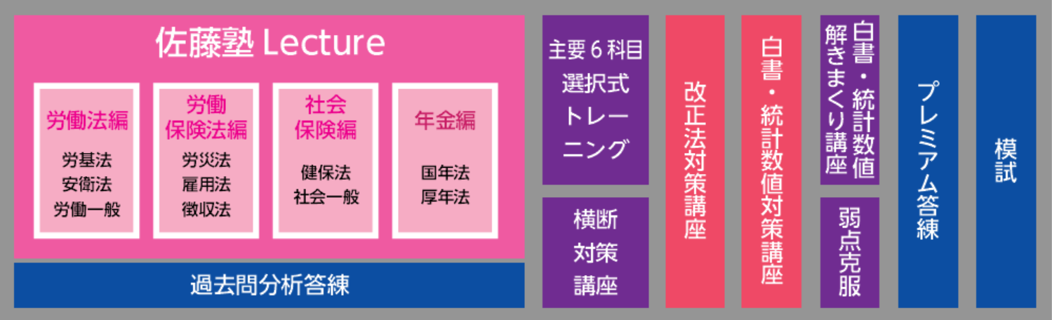 特別編成カリキュラムによって、インプット講義の科目の順番が、「労働法編→労働保険編→社会保険編→年金編」となっています。