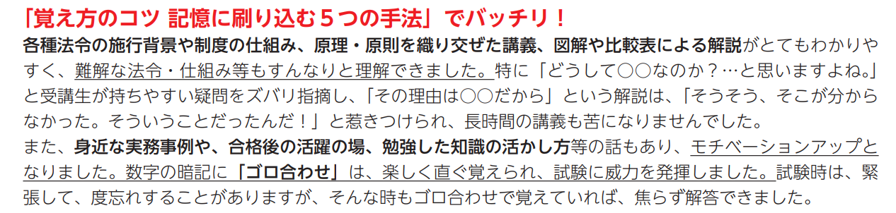 要するに、どうやって覚えるべきなのかを常に研究し、ある箇所ではテキストやレジュメ等に図表を掲載したり、別な箇所では講義でその理屈を皆さんに明確にお伝えしますので、「なるほど!そういうことか!!」となり、覚えやすく記憶に残りやすくなるため、択一式の得点が伸びる訳です。