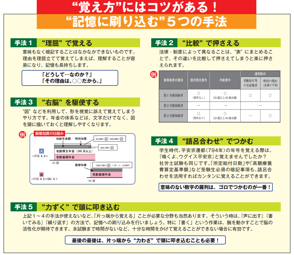 そこで、佐藤塾では、その重要箇所を的確に覚えるために、「理屈」で覚えるのか、「比較」で押さえるのか、「右脳」で理解するのか、「ゴロ合わせ」でつかむのかという覚え方・押さえ方まで整理して皆さんにお伝えしていきますので、十分な理解を伴うとともに納得して次へ進むことが可能となります。